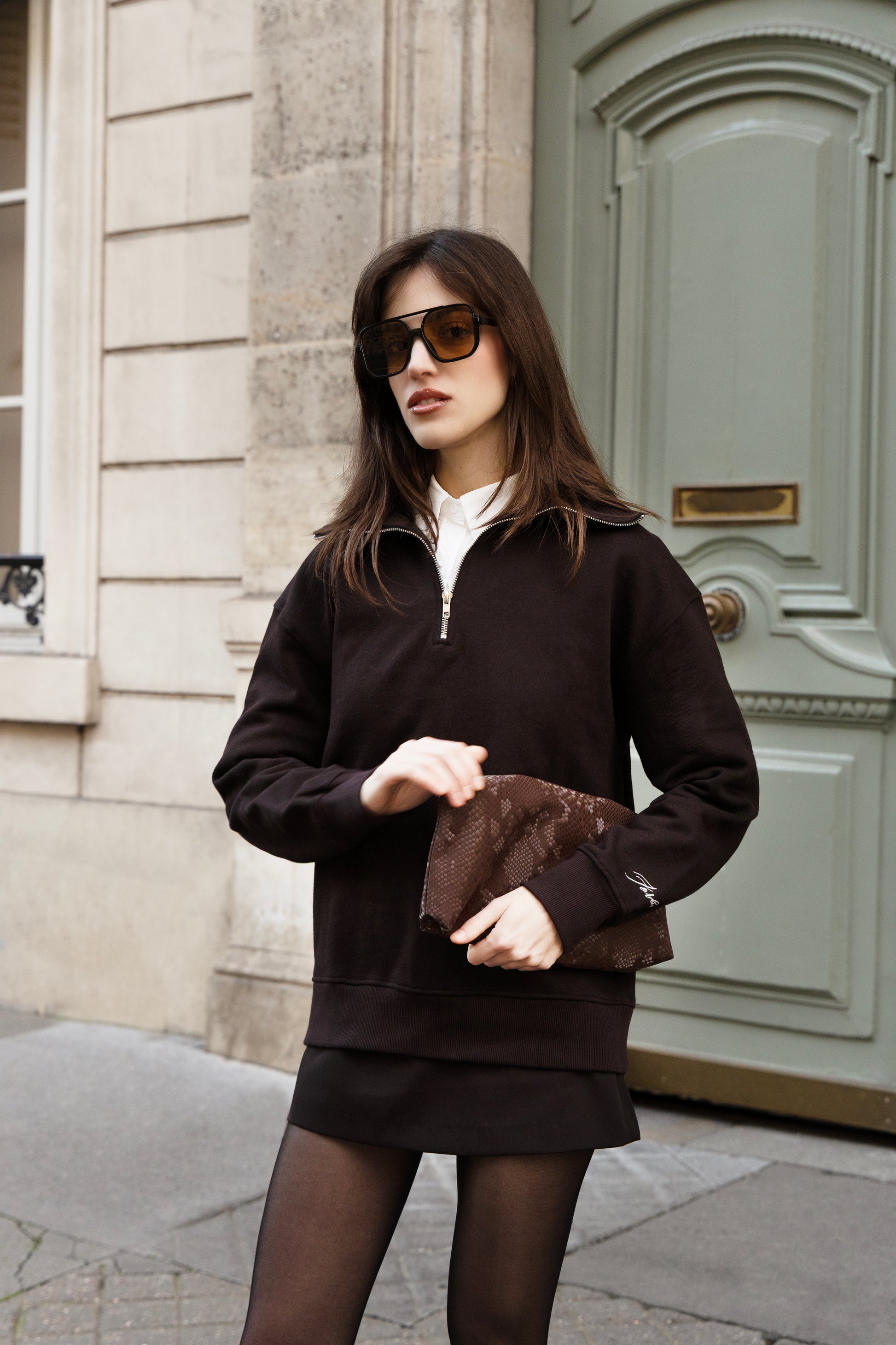 A refined high-neck zip top crafted in a deep brown tone inspired by southern french landscapes.Designed with a sleek short zipper and a functional chest zip pocket for modern utility. Finished with subtle FORBÚRI embroidery on the left sleeve above the cuff for a signature touch.A clean, elevated everyday essential for effortless Parisian style.